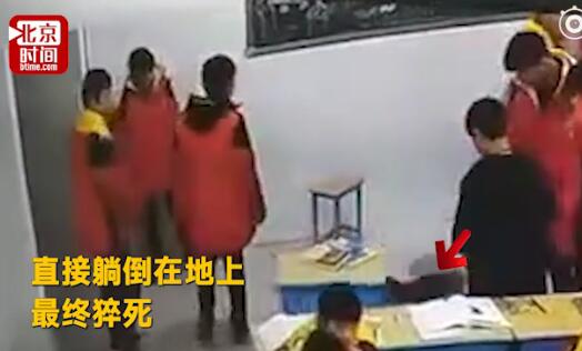 视频显示,在一间教室内,包括猝死者在内的3名学生,把一个矮个同学围在门背后的角落里“拷问”,