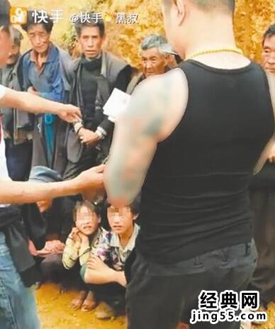 荒凉的土坡前,一群衣着破旧的当地村民站成一排,孩子们则蹲在地上。一名年轻人正从他们手里收回刚刚才发给他们的钱:每人2000元